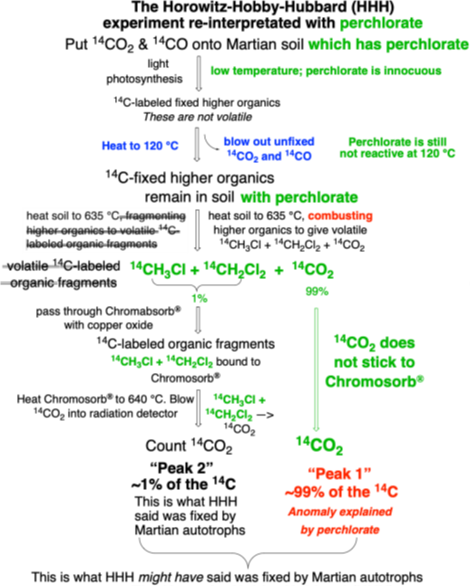 As we shall see in the next sets of single scoops when we discuss gas chromatography-mass spectrometry results, separate experiment that heated the Martian soil without adding any 14CO2 or 14CO saw the evolution of CO2, CH3Cl, and CH2Cl2. That is, it detected the perchlorate oxidation of organics in the Martian soil. Thus, since 2009, the HHH experiment could have the interpretation shown in Fig. 1.