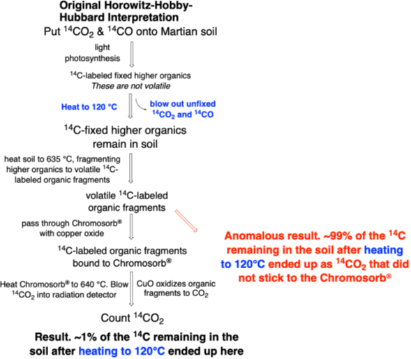 (e) However, one cannot confidently make this combination, because of a false positive possibility that also was recognized, but not mitigated, by the HHH team as they prepared their experiment to fly. If the Martian soils were alkaline, some of the 14CO2 would be absorbed on the soils not by its transformation into organics, but rather as carbonates and bicarbonates. This label might have been flushed out at 120 °C, but it might not have been, but instead released only at 635 °C. It is possible that some of the Peak 1 label could contaminate the Peak 2 label, although the HHH team went to some lengths to rule this out.